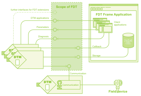 As a runtime environment, a DTM needs a so-called FDT Frame Application. This Frame Application must provide the interfaces as defined in the FDT specification. Typically, the FDT-Frame Application comprises client applications that use DTMs, some kind of database for persistent storage of device/DTM data, and a communication link to the field devices. FDT-Frame Applications may be represented by applications like engineering tools for control systems (probably the complete control system) or standalone tools for device configuration. These applications are called ‘Frame Applications’. Throughout this document the terms ‘FDT-Container’ and ‘Frame Application’ are used as synonyms. Client applications are seen to be single applications focusing on special aspects like configuration, observation, channel assignment etc. and using the functionality provided by the DTM who is the server. The FDT Specification specifies COM interfaces (what the interfaces are), not the implementation (not the how of the implementation) of those interfaces. It specifies the behavior that the interfaces are expected to provide to client applications that use them. The FDT-Specification neither specifies the implementation of DTMs nor the implementation of Frame Application. Included are descriptions of architectures and interfaces which seemed most appropriate for those architectures. Like all COM implementations, the architecture of FDT is a client-server model where DTMs are the Server components managed by the Frame Application. | ||