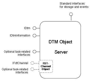 The interfaces IDtm and IDtmInformation have to be implemented by each DTM. These interfaces provide the base functions and information for controlling a DTM. From a Frame Application’s point of view, all task-related interfaces for the interaction with the device functionality are available via these interfaces. Which task related interfaces are provided depends on the capability of the DTM and the according device. Each interface will be described in detail at its own chapter. In order to represent the device’s I/O connections or process values accessible for data exchange with the Frame Application, the DTM can implement an FDT-Channel object (Process Channel). This object implements at least the IFdtChannel interface that gives access to all parameters of the channel which describes the channel itself. If the device provides communication functionality, like a fieldbus adapter or a gateway, the FDT-Channel object must implement further interfaces for the communication via this channel (Communication Channel). Each interface of the FDT-Channel object will be described in detail at its own chapter. | ||