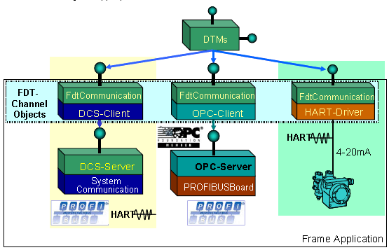 From a DTM point of view, all task-related interfaces for the interaction with Frame Application are available via the main interface IFdtContainer of the Frame Application. Which task-related interfaces are provided depends on the capability of the Frame Application. Each interface will be described in detail at its own chapter. In a complex plant environment, there are also complex communication networks for linking the process devices. No DTM should need any information about the topology of a system network. So it is up to the Frame Application to organize the routing for accessing a device. The Frame Application has to provide in each case a peer-to-peer connection (physical or logical). So its up to the Frame Application to manage the multi user access to a device. To represent its communication capabilities a Frame Application can implement FDT-Channel objects. The Frame Application’s channels represent the gateway from the FDT-specific to the Frame Application-specific communication. At least the interface IFdtCommunication must be implemented for a channel of a Frame Application. On the Frame Application’s side the communication channel can be a PC I/O board or engineering topology with processing units and proprietary bus systems. IFdtCommunication always provides the communication functionality for DTMs to access their fieldbus devices. All actions that belong to the physical fieldbus have to be done by using this interface. Each DTM can communicate with each FDT- communication channel provided that the FDT-Channel supports the appropriate communication protocol. The association of a DTM with a specific FDT-Channel is done by configuration. The topology information for configuration is stored in the Frame Application’s database via the IFdtTopology interface. A FDT- communication channel must be able to handle several connections to the same device and can be responsible for connections to different devices. The component guarantees that a link to a device is established as a peer-to-peer connection. The unique peer-to-peer connection is necessary for the asynchronous communication especially the management of the invoke IDs. Only for the peer-to-peer connection, the DTM has to guarantee that the used invoke IDs are unique for all of its communication processes (e.g. configuration and observation in parallel). In general one and the same DTM can communicate with devices of the same type attached to different fieldbus interfaces using the appropriate FDT- communication channels.
