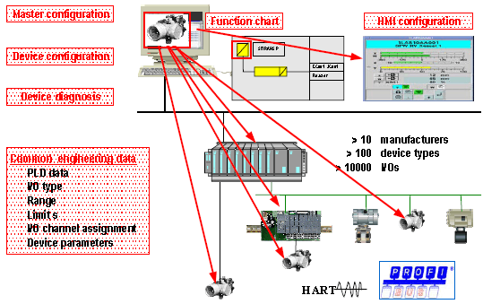 The integration of the field device technology into the engineering systems of process control technology is not only to be limited to a small, generally valid set of configuration, service and diagnostic functions - that would mean integration of the PROFILE definitions as a basic definition for field devices. Instead, the integration is to result in the individual device properties, characteristics and special features of the different device types being supported. The planning and service tools provided by the device manufacturer are to be integrated as device-specific software components into the engineering system. The device manufacturer defines the configuration, service and diagnostic functions for his devices himself and also designs the appearance of his devices in the engineering environment of the process control system. It must then be possible for these components to be integrated into the engineering systems of all control technology suppliers. This reduces the costs for the device manufacturer, as he only needs to offer one standardized software component with all configuration, service and diagnostic functions for an intelligent field device. The frequent project-specific or control system-specific adaptations, which have to be developed and maintained over and over for one device type, are to be eliminated as a result of a standardized component technology. The control system manufacturer has to implement the defined interfaces for the integration of all fieldbus devices only once. Manufacturer-specific and/or device-specific implementations and their maintenance are eliminated.