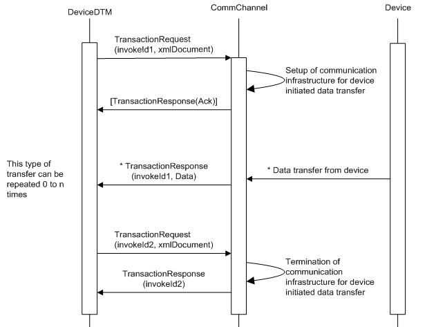 - the device initiated data transfer is transported by transaction responses to the initiating request (they carry the same invokeId)
