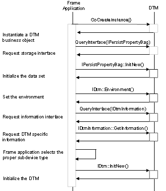 After creation of a DTM business object the Frame Application must request the IPersistXXX interface pointer and call IPersistXXX::InitNew(). Within this method the DTM business object must initialize its default device parameters.