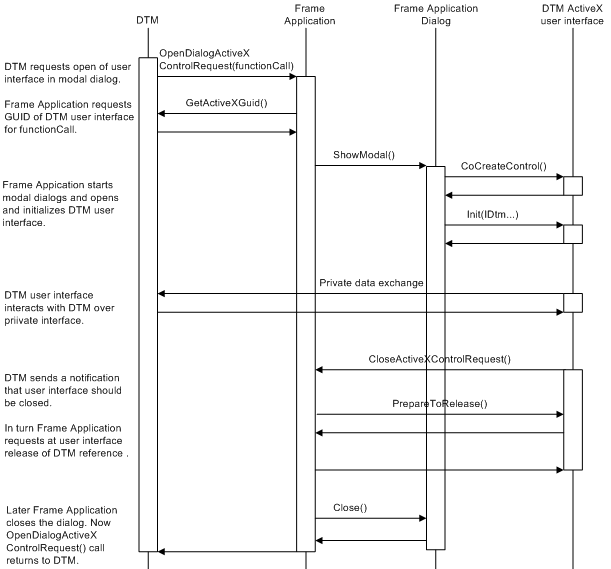interface implemented by Frame Application. This starts modal dialog and opens DTM user interface in it. DTM user interface exchanges data with DTM over private interface and request closing of dialog after work is finished. Frame Application closes the dialog and DTM user interface. Now