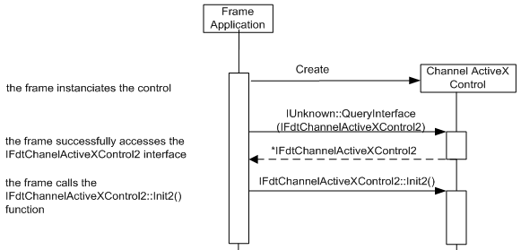 This diagram describes the sequence of the channel ActiveX control initialization for the case that the channel ActiveX control provides the IFdtChannelActiveXControl2 interface.