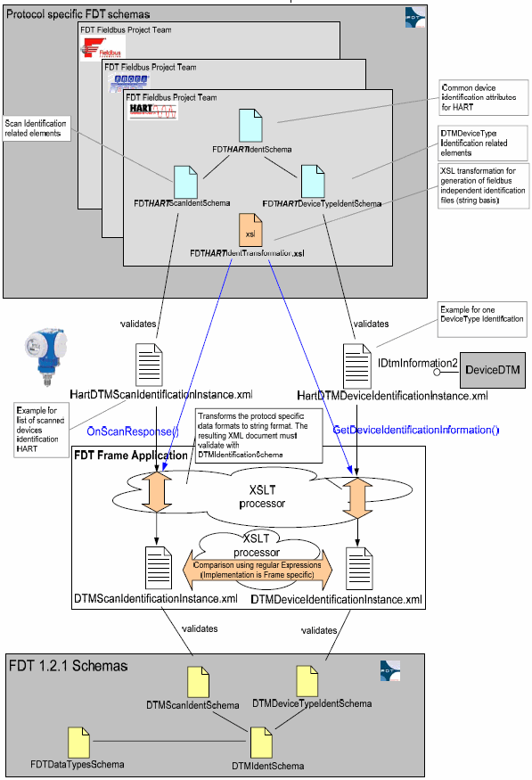 The following picture shows, how protocol specific schemas are integrated in the FDT specification and